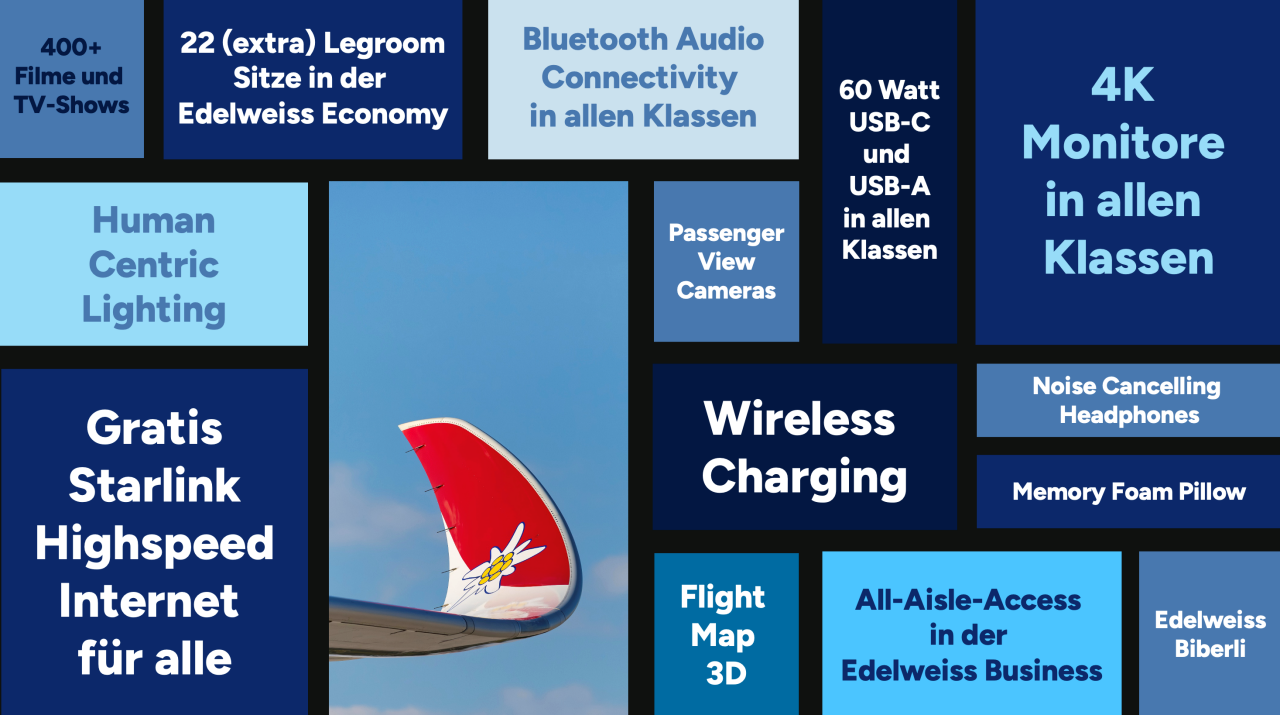 The offering is complemented by wireless charging in Edelweiss Premium Economy, Edelweiss Business, and Edelweiss Business Suite, as well as high-performance USB-C and USB-A ports at all seats with up to 60 watts of power, allowing for convenient laptop charging. Additional power outlets are available in Edelweiss Business and Edelweiss Business Suite. Noise-canceling headphones provide added comfort in Edelweiss Premium Economy, Edelweiss Business, and Edelweiss Business Suite.